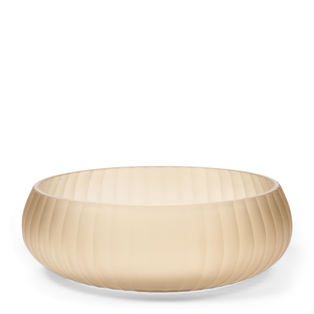 Deze stijlvolle glazen schaal is een subtiele blikvanger in elk interieur. De zachte zandkleur in combinatie met het verfijnde, verticale ribbelpatroon geeft de schaal een warme en moderne uitstraling. Dankzij de lage, ronde vorm is dit item perfect als decoratieve schaal op tafel of dressoir.